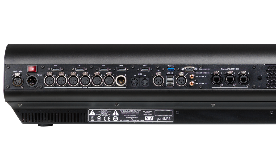 La consola grandMA3 CRV (Versión para Sala de Control) de tamaño completo es el modelo estrella de la gama, pero se suministra sin el soporte para monitor. Diseñada para su uso en salas de control con visibilidad reducida, la grandMA3 CRV de tamaño completo cuenta con tres puertos adicionales para monitores externos que facilitan la ubicación de pantallas táctiles externas de terceros sin comprometer su funcionalidad.